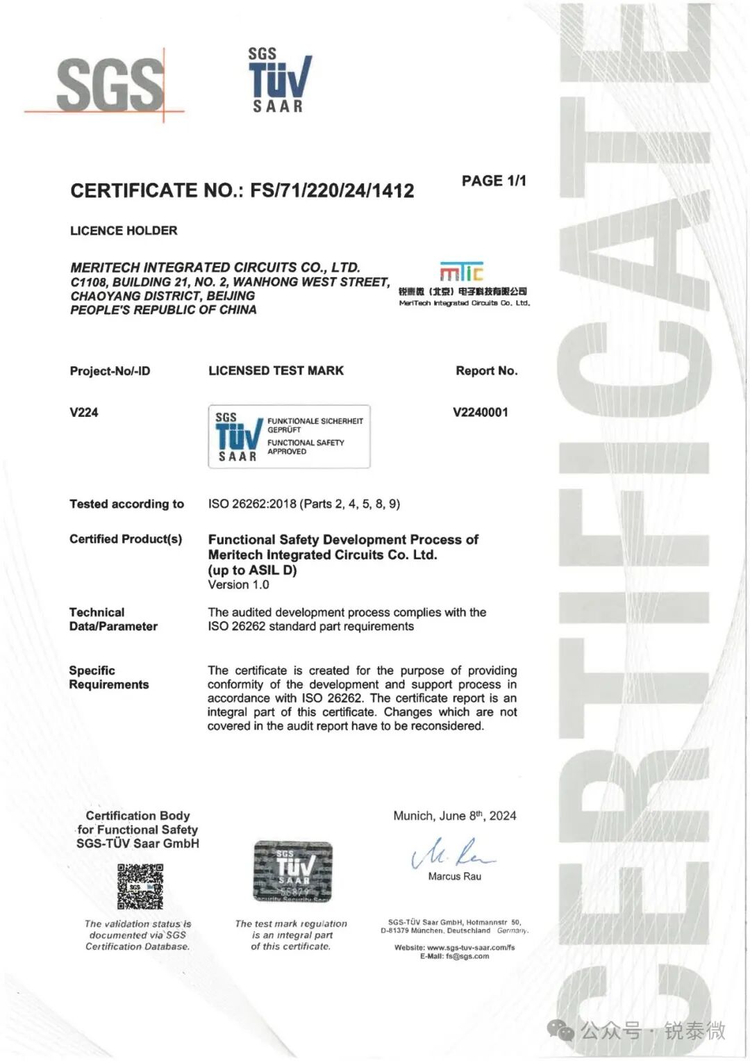 经过SGS的独立审核,锐泰微构建的功能安全标准开发流程符合ISO 26262:2018 标准要求,获颁功能安全ASIL D流程认证证书,此举将为锐泰微未来的功能安全产品开发和认证奠定坚实基础。